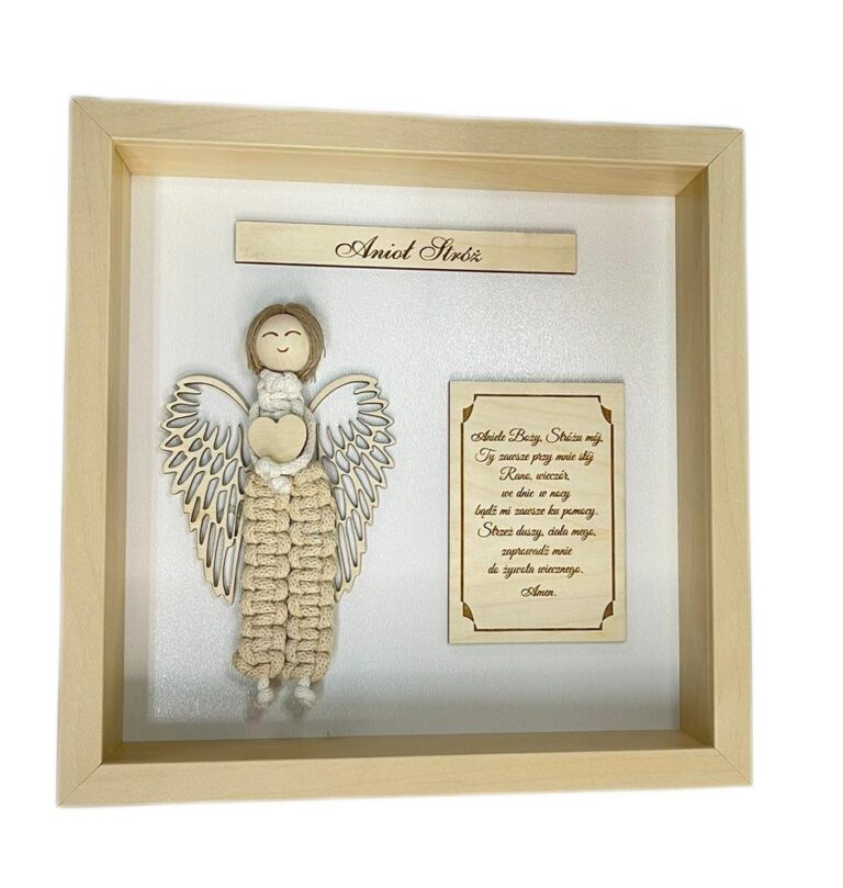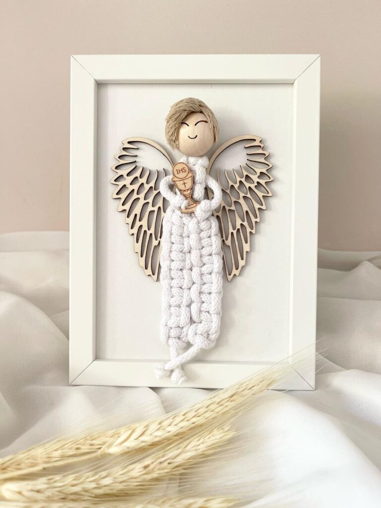ANIOŁEK MAKRAMA W RAMCE NA PIERWSZĄ KOMUNIĘ PAMIĄTKA