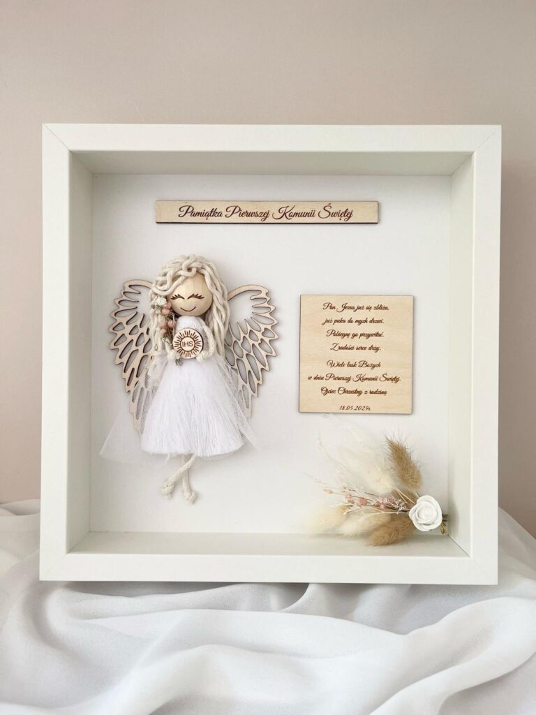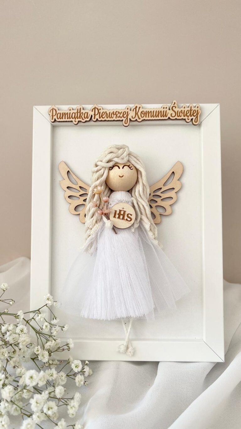 ANIOŁEK MAKRAMA W RAMCE NA PIERWSZĄ KOMUNIĘ PAMIĄTKA DZIEWCZYNKA