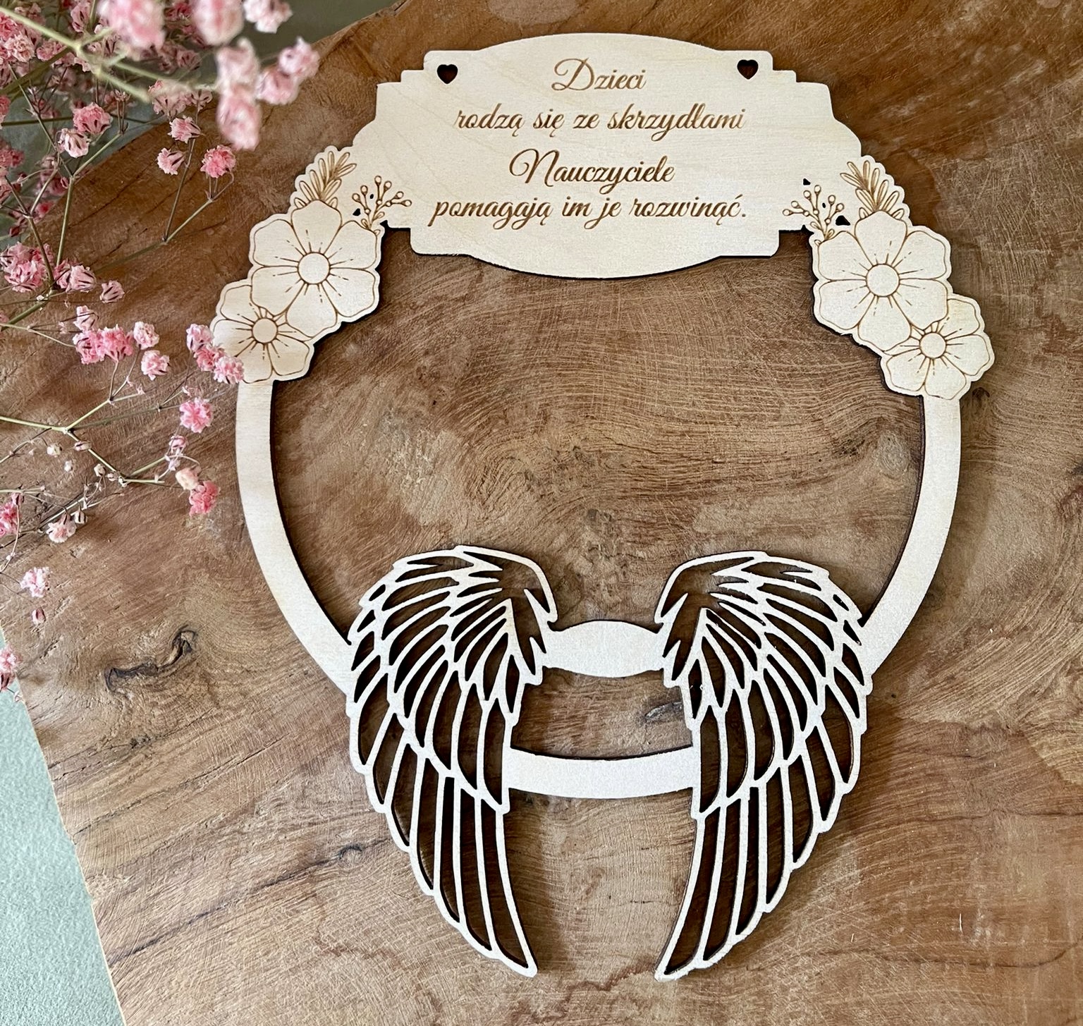 DREWNIANA OBRĘCZ Z NAPISEM, SKRZYDŁAMI I KWIATAMI