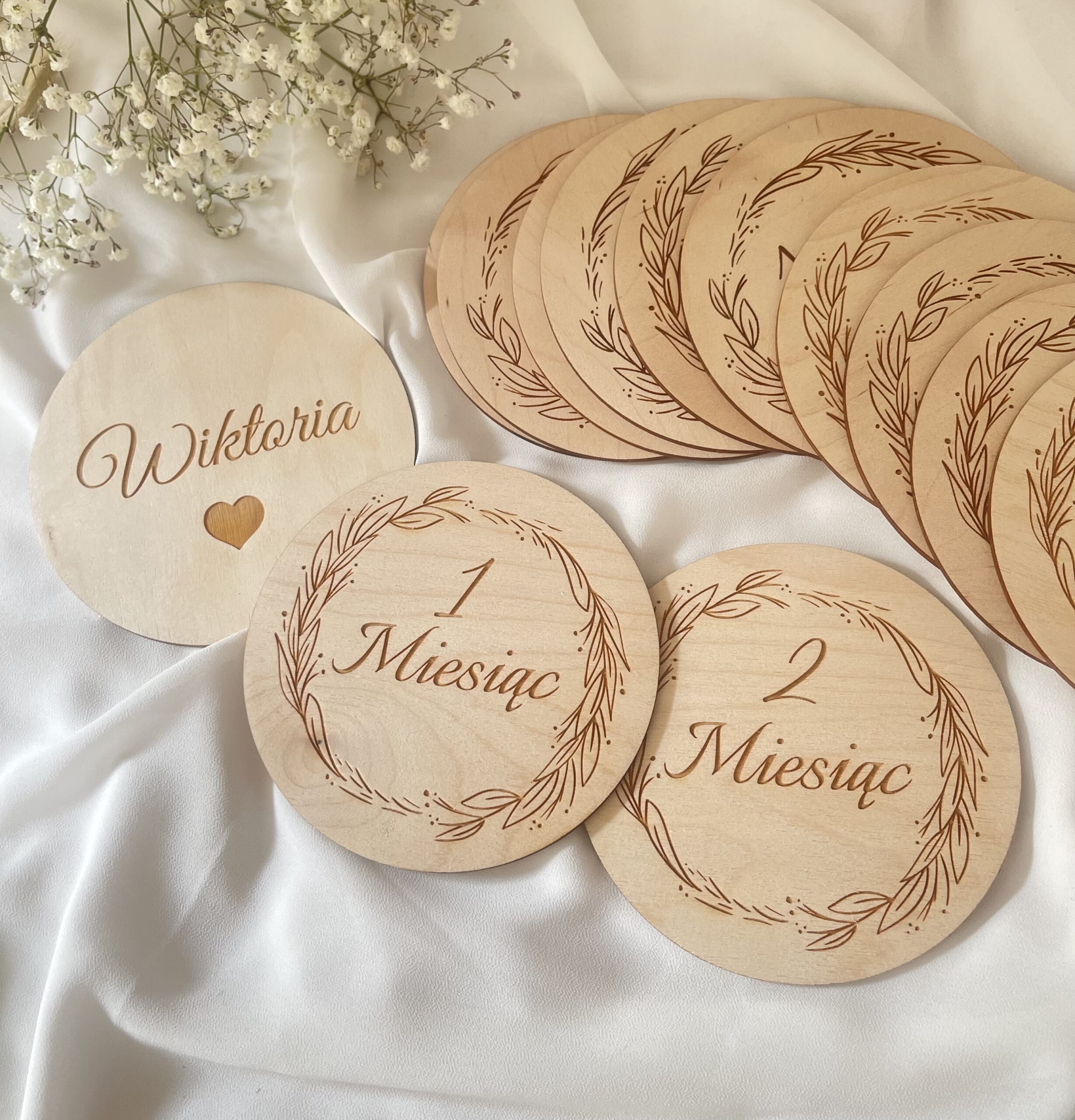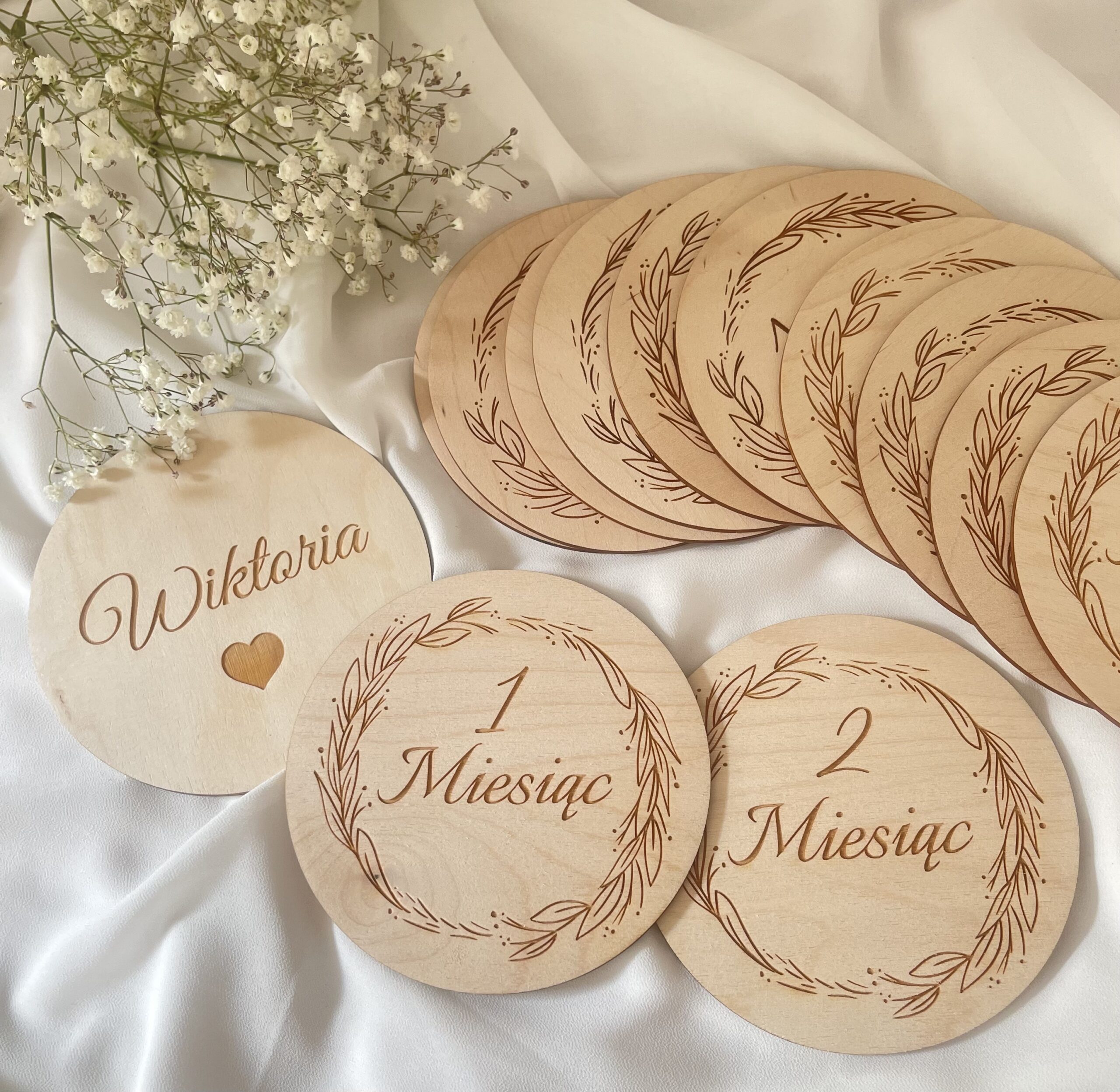 Każde koło wykonane jest z naturalnej sklejki brzozowej i ozdobione delikatnym, laserowym grawerem w formie wieńca. Zestaw zawiera 12 tabliczek – od „1 miesiąc” do „12 miesięcy” – oraz tabliczkę personalizowaną z imieniem dziecka, dzięki czemu całość nabiera wyjątkowego, indywidualnego charakteru.