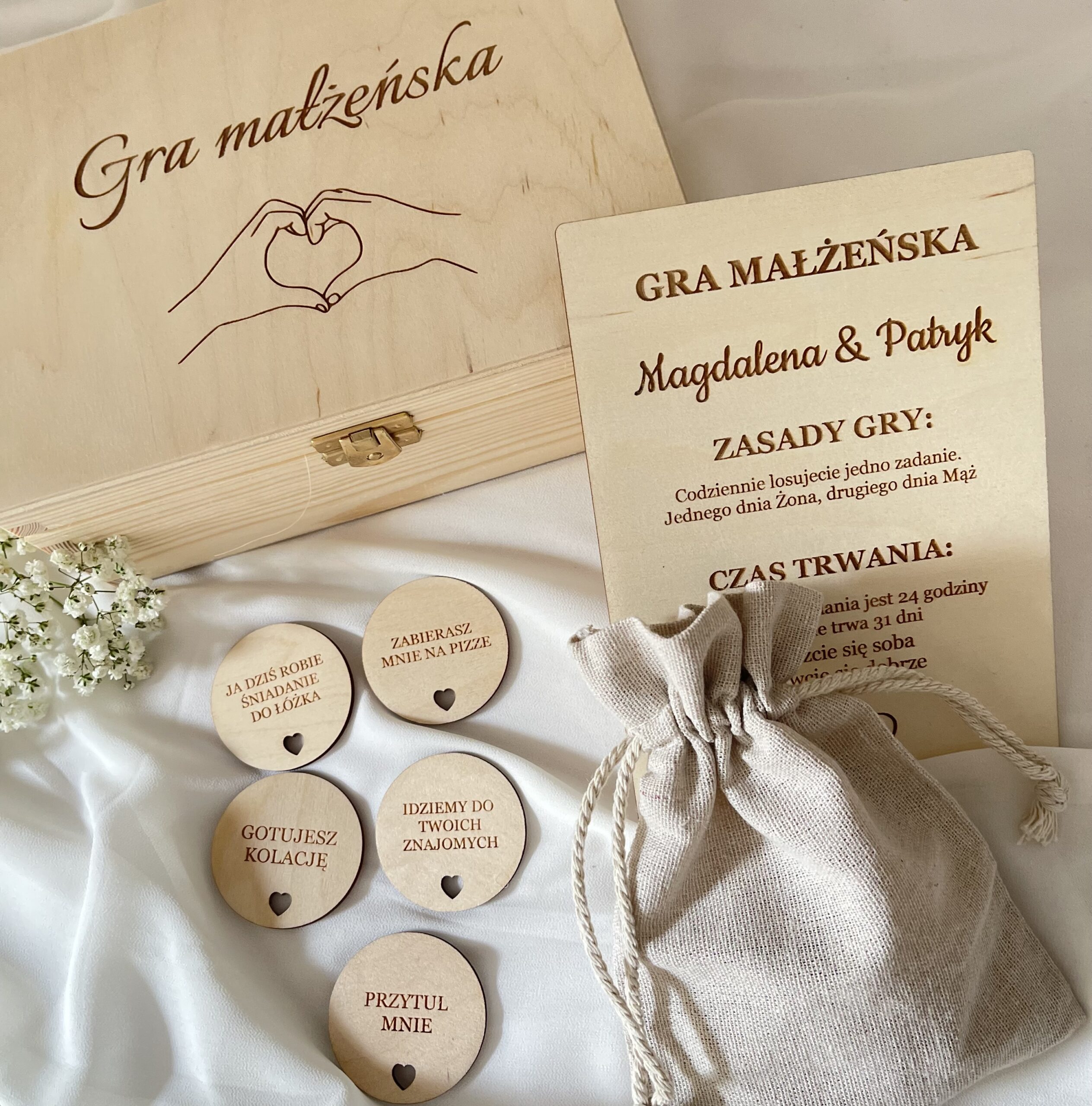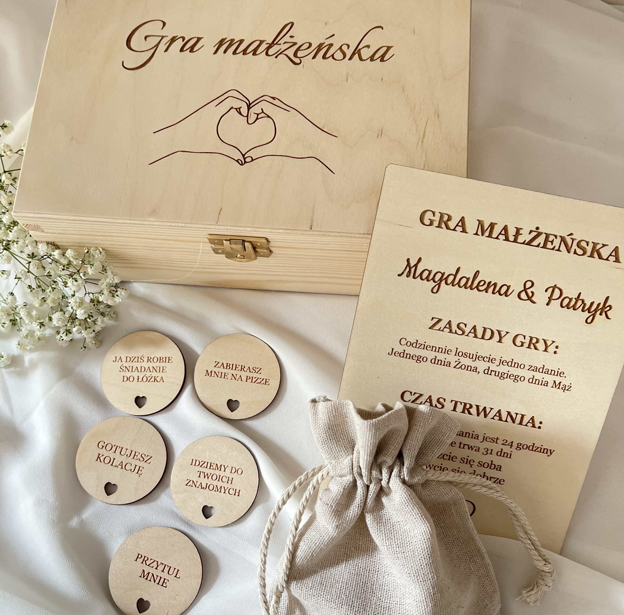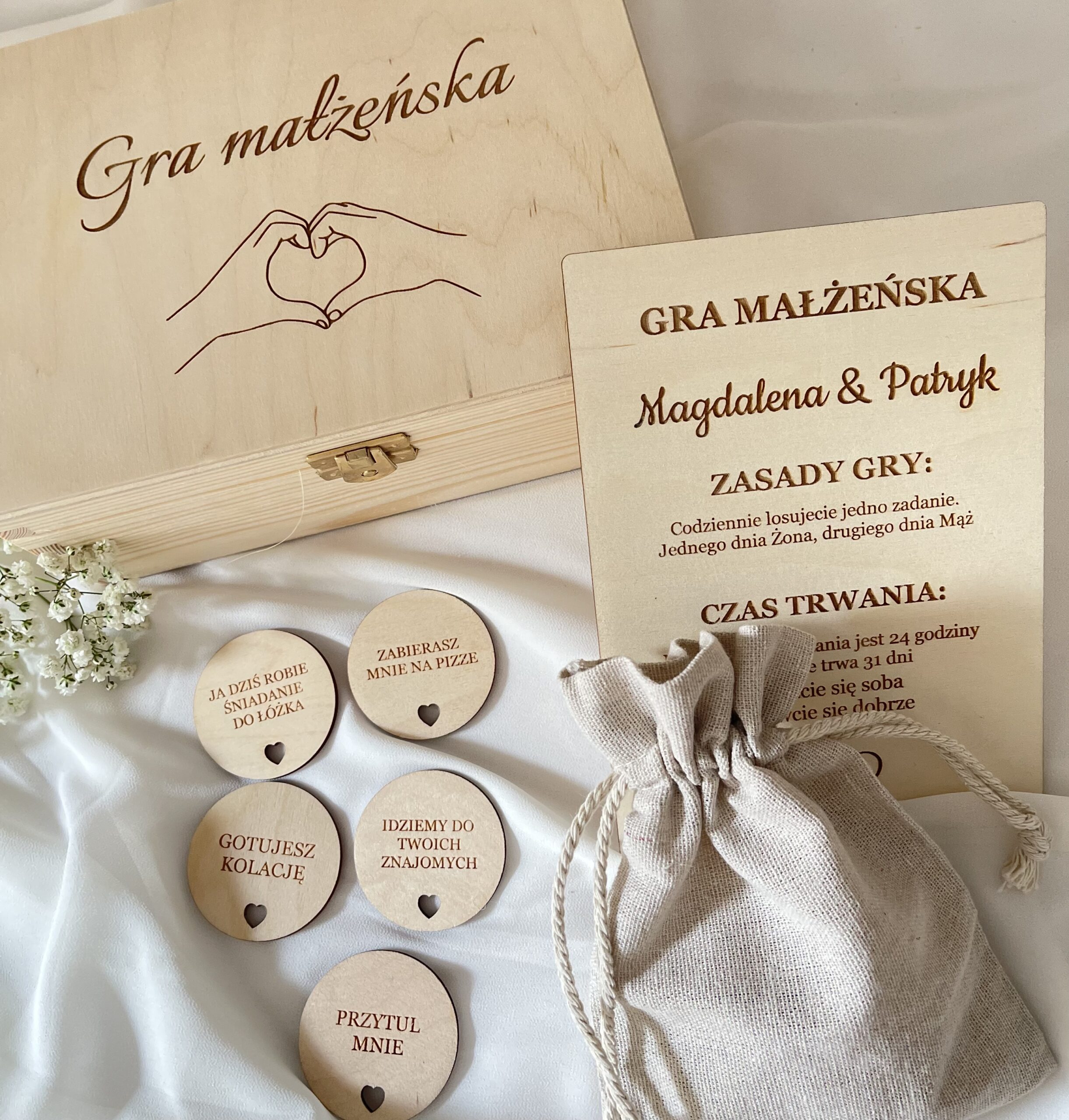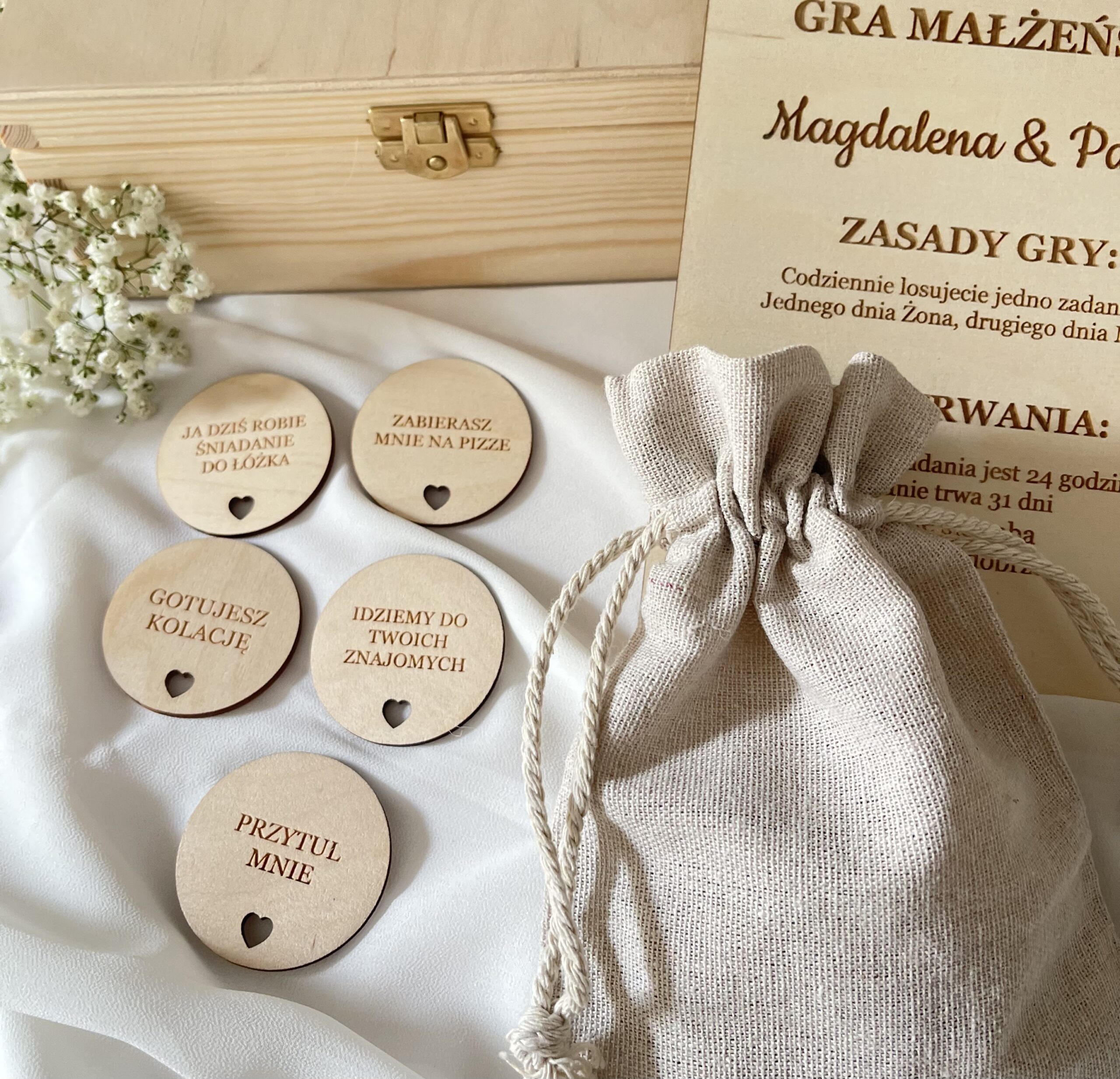 • 31 drewnianych żetonów z zadaniami (dla niej i dla niego)