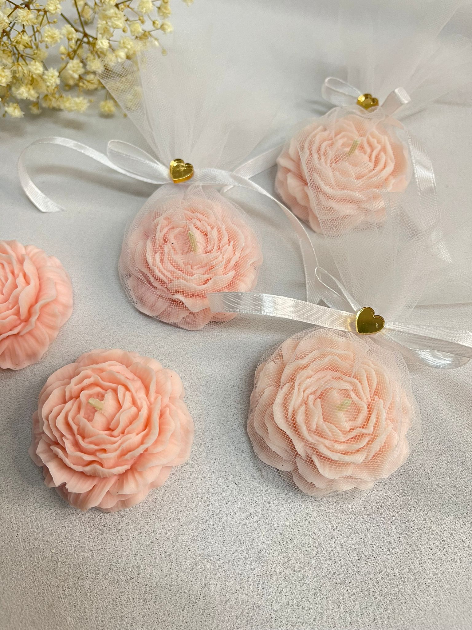Elegancka i subtelna piwonia zapachowa zapakowana w delikatny woreczek z organzy, przewiązana satynową wstążką z ozdobnym złotym serduszkiem. To piękne i uniwersalne podziękowanie dla gości na wyjątkowe okazje.
