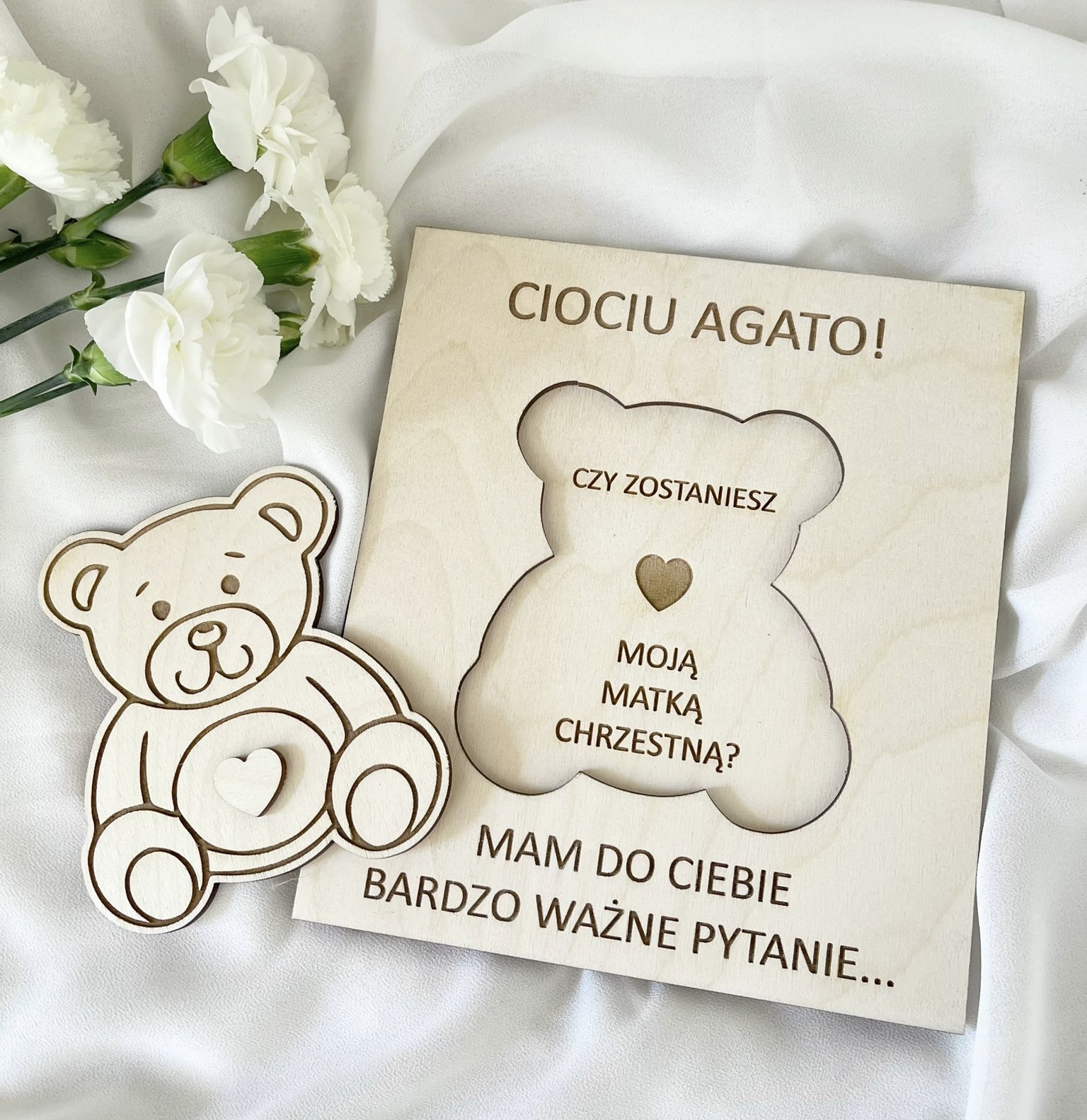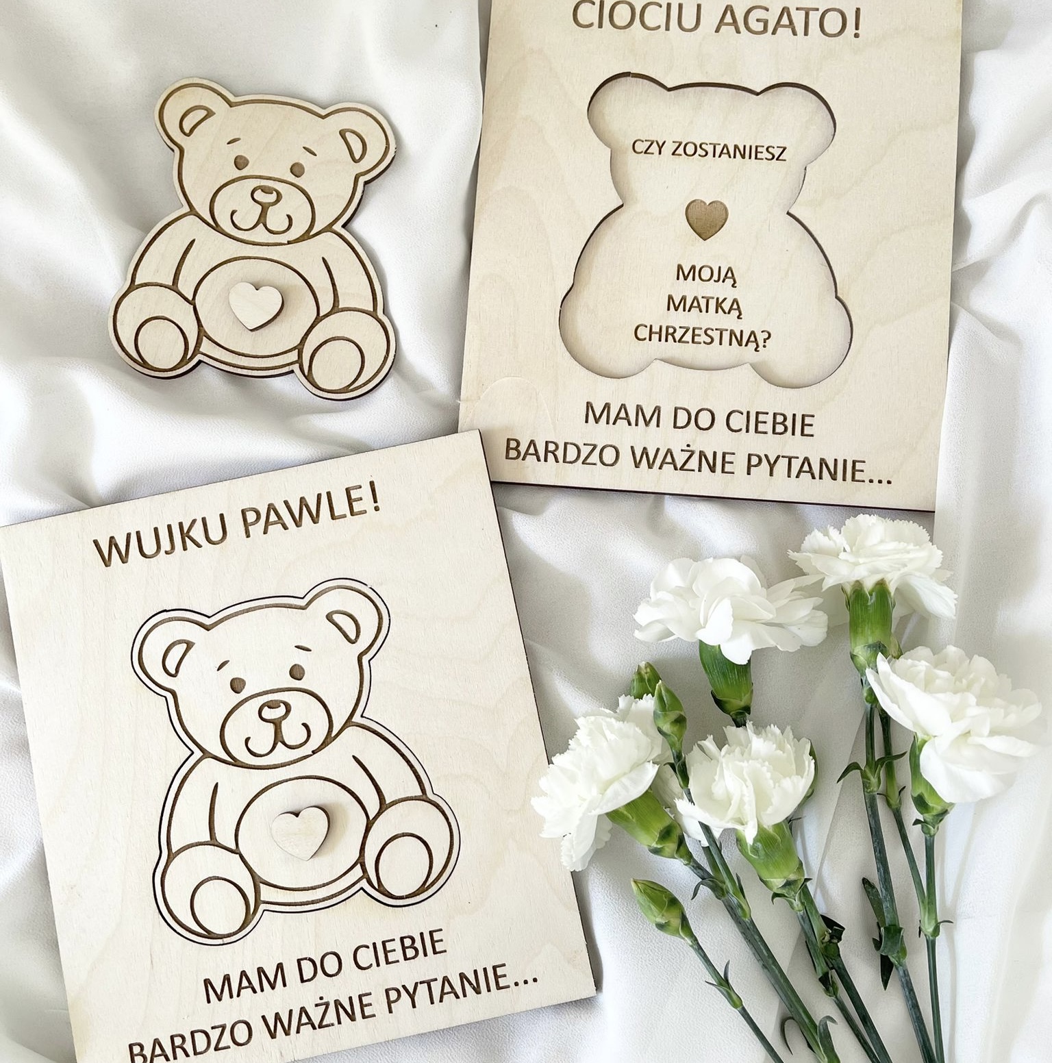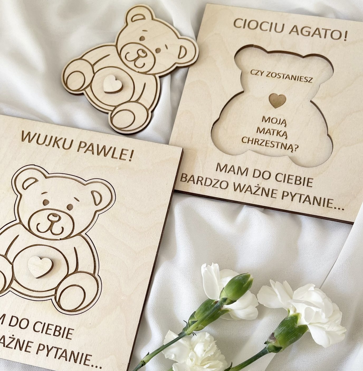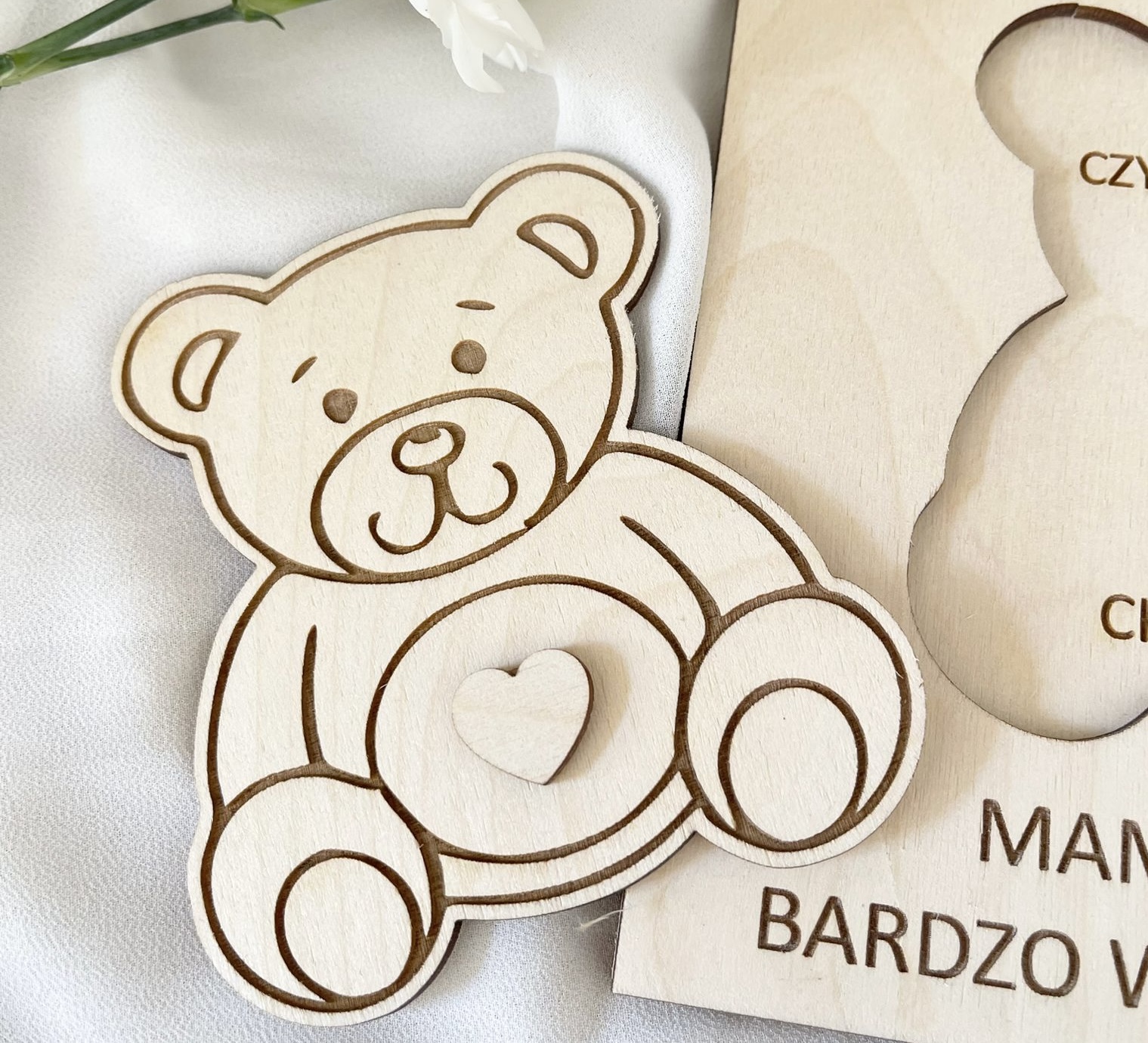 To urocze, drewniane zaproszenie w formie misia z serduszkiem, wykonane ze sklejki brzozowej, zachwyca prostotą i ciepłem.