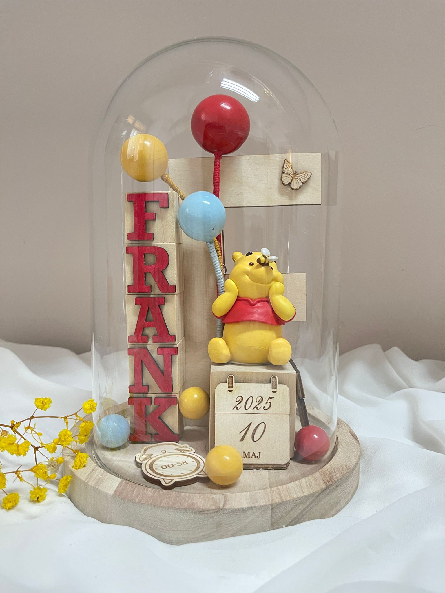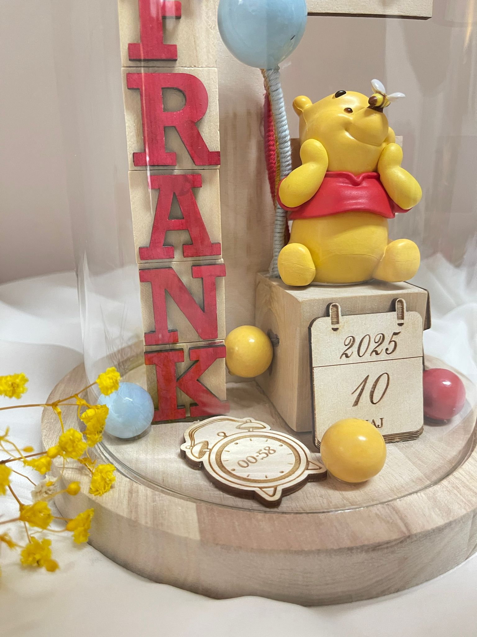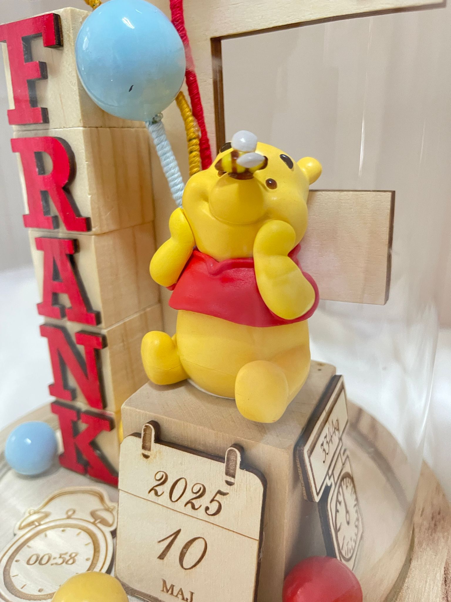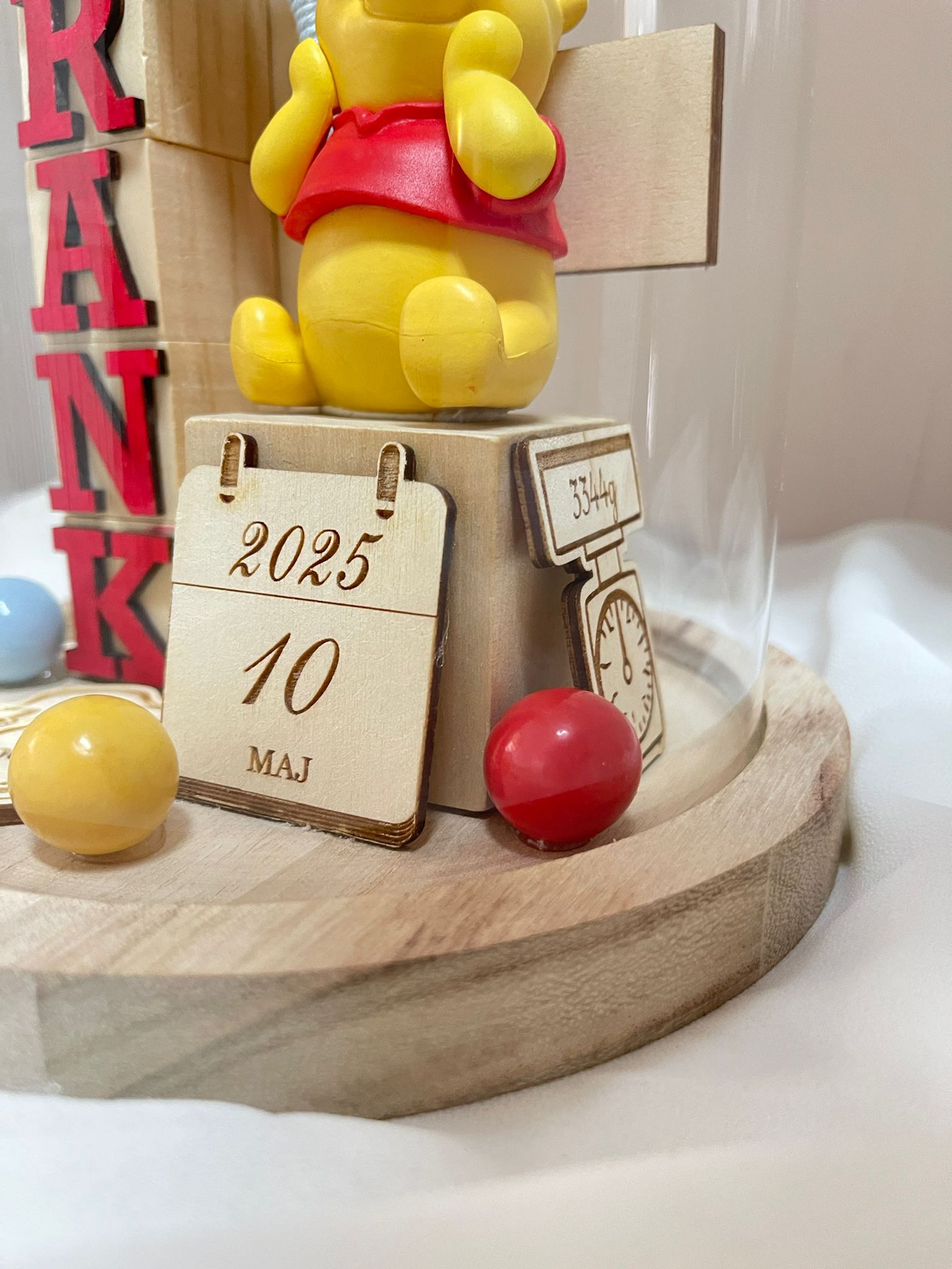 Metryczka dostępna jest w dwóch wersjach kolorystycznych – dla chłopca i dla dziewczynki, co pozwala dopasować ją do wystroju wnętrza. Całość zamknięta w szklanym kloszu nadaje elegancji i chroni przed kurzem, dzięki czemu pamiątka pozostanie piękna na długie lata.