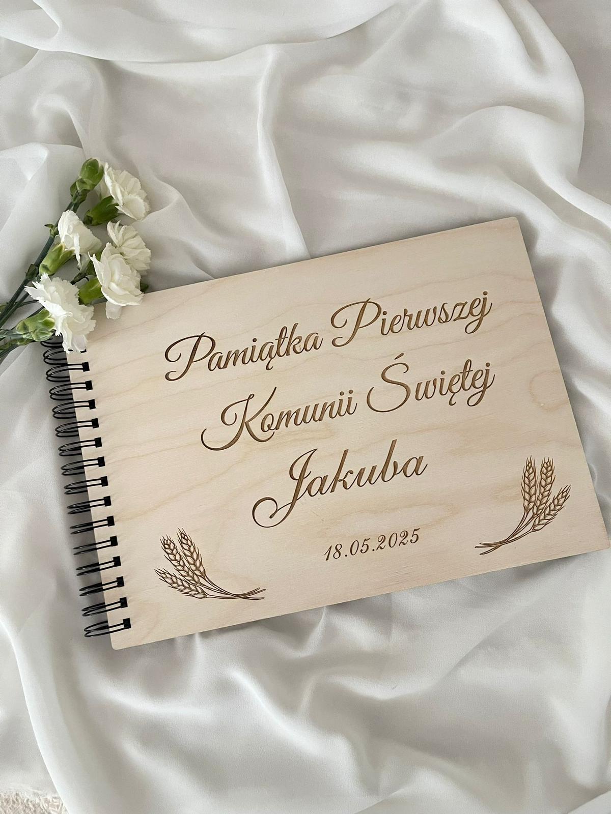📖 Personalizowany Album na Pierwszą Komunię Świętą – Drewniana Okładka z Grawerem