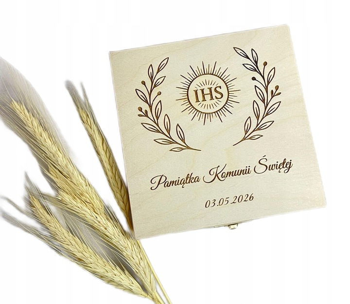 Drewniane pudełko PIERWSZA KOMUNIA ŚWIĘTA– personalizowana pamiątka