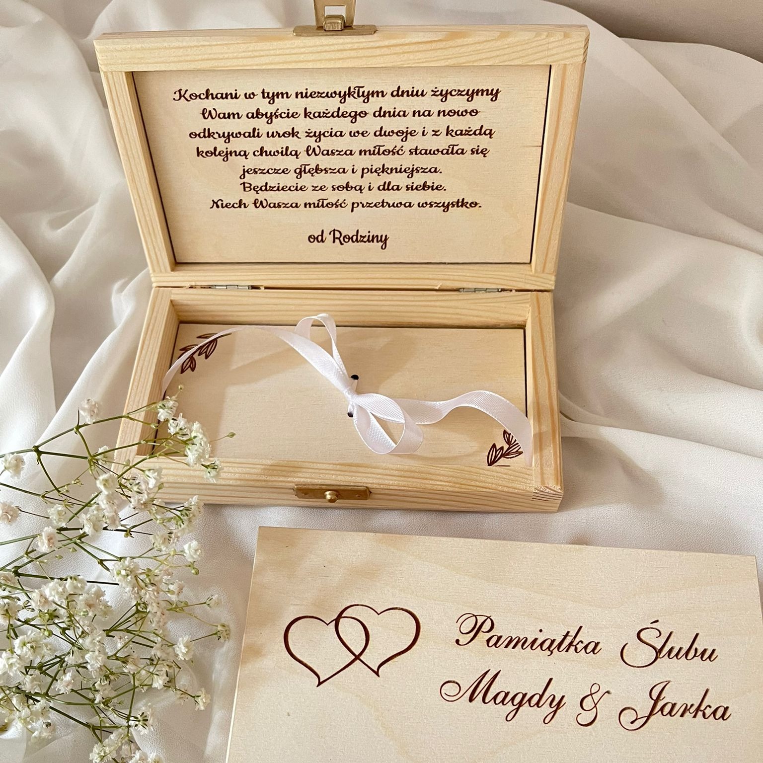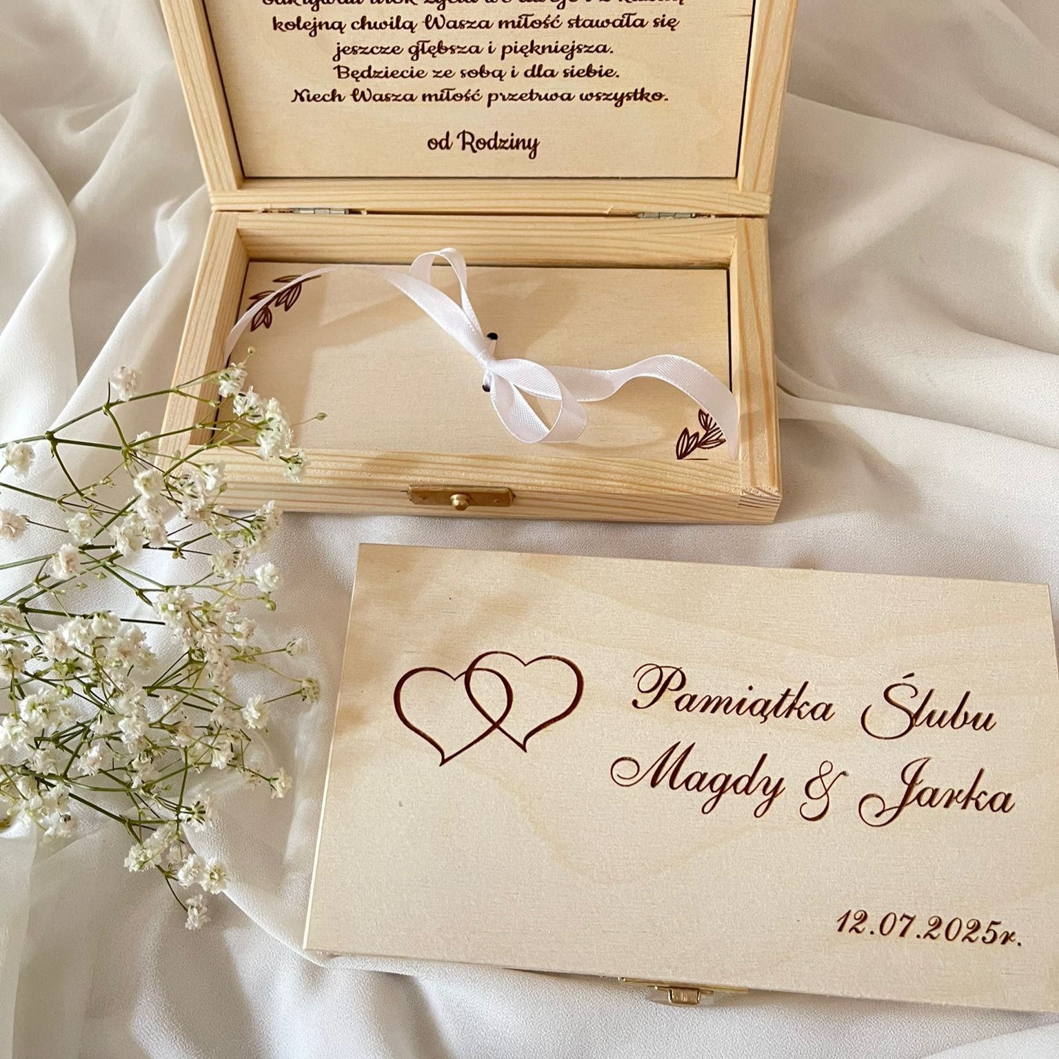 PERSONALIZOWANA DREWNIANA SKRZYNECZKA ŚLUBNA NA PIENIĄDZE SERCA