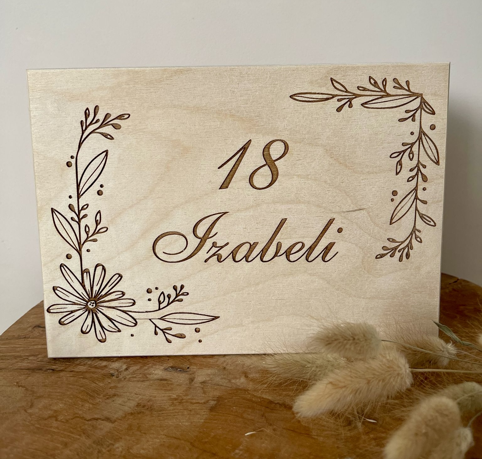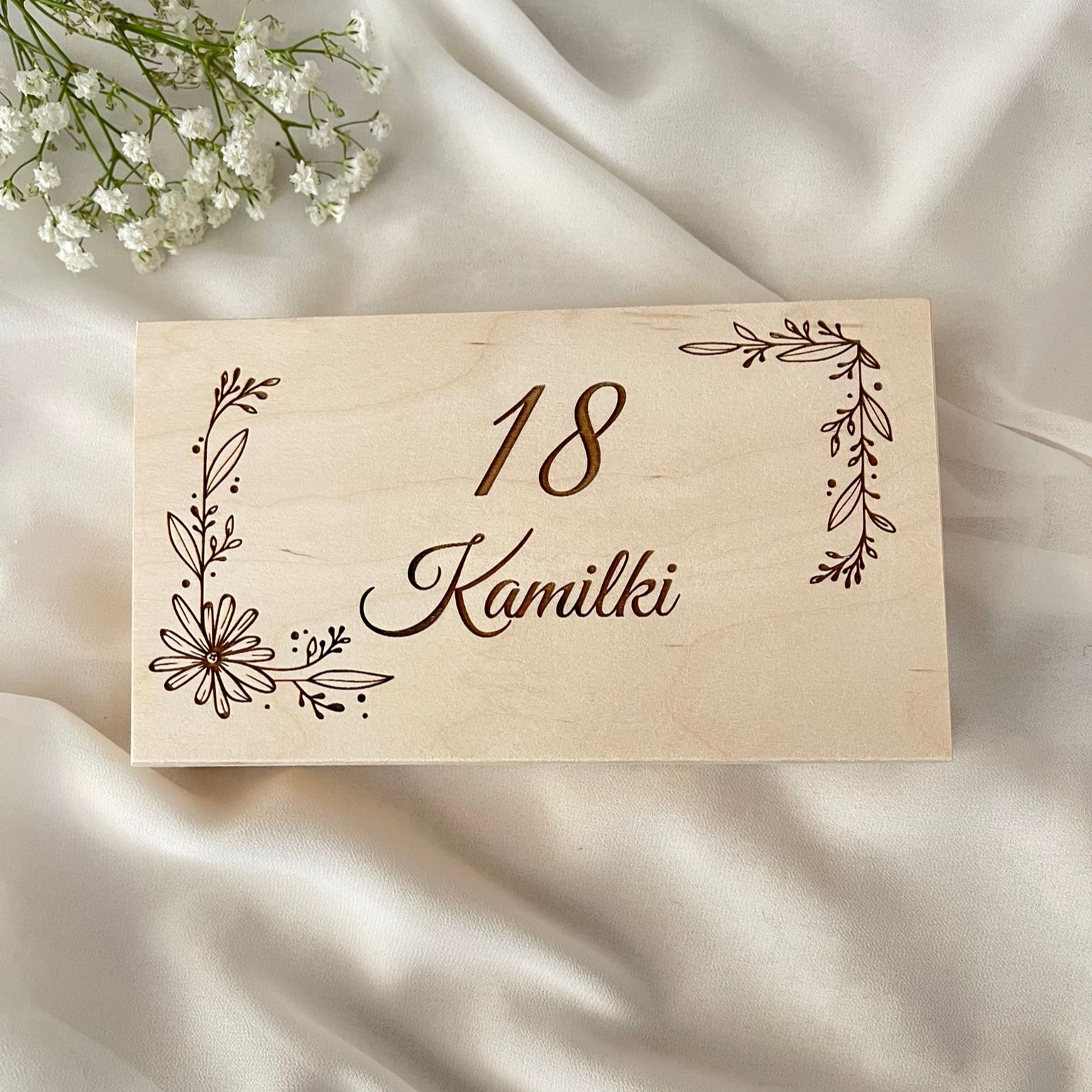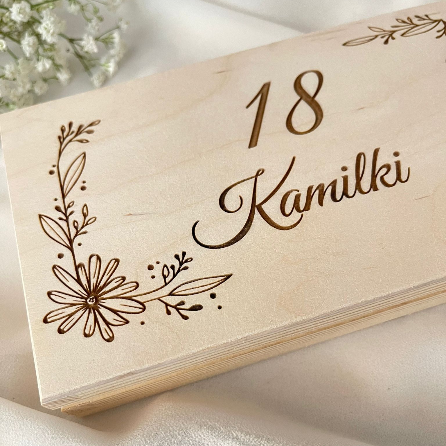 Personalizowane pudełko na pieniądze z imieniem – idealne na urodziny i nie tylko! Drewniane, ozdobione delikatnym grawerem kwiatowym, sprawdzi się jako elegancka pamiątka na różne okazje. W środku możliwość wyboru gotowych życzeń.