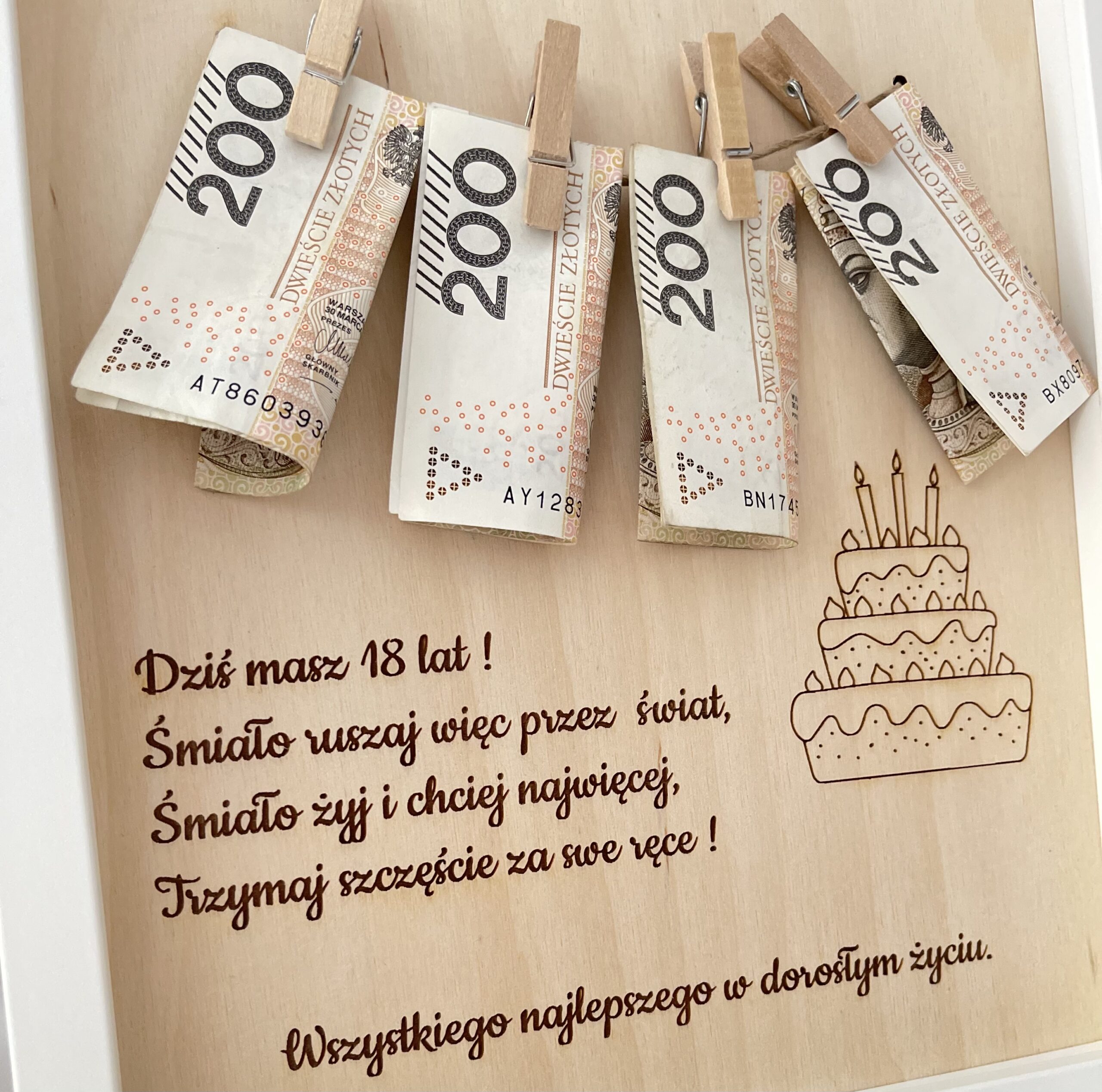 Nasza tabliczka urodzinowa z grawerem na sklejce, oprawiona w elegancką ramkę, to zabawny i kreatywny sposób na wręczenie gotówki – ale z humorem!