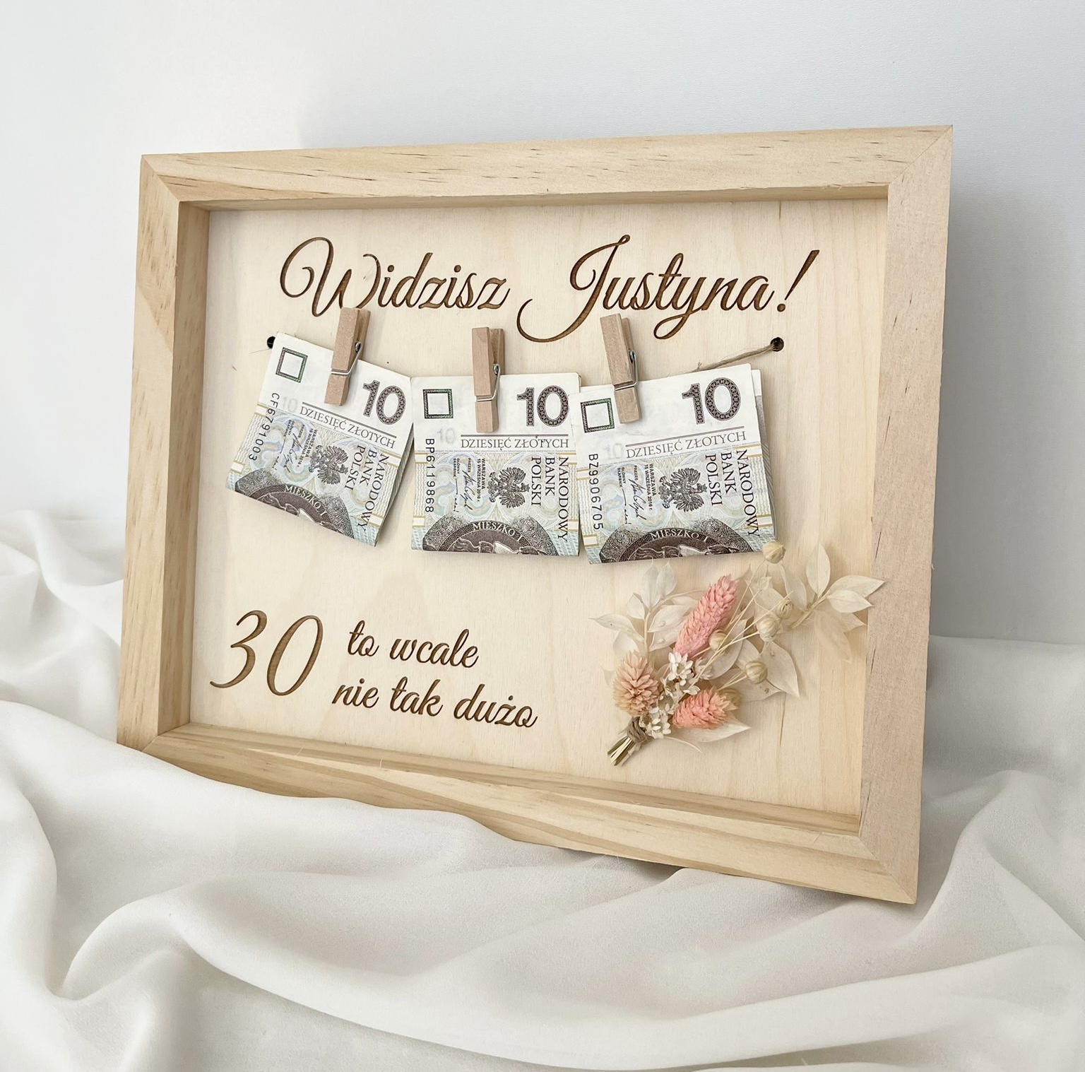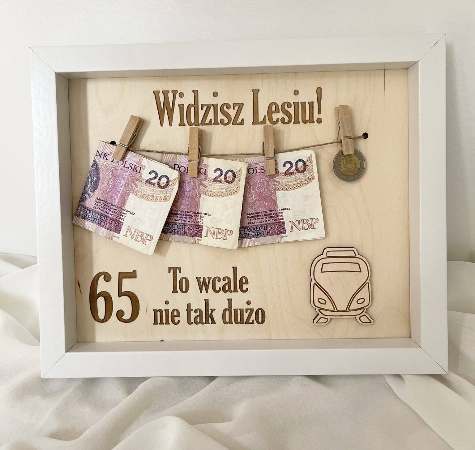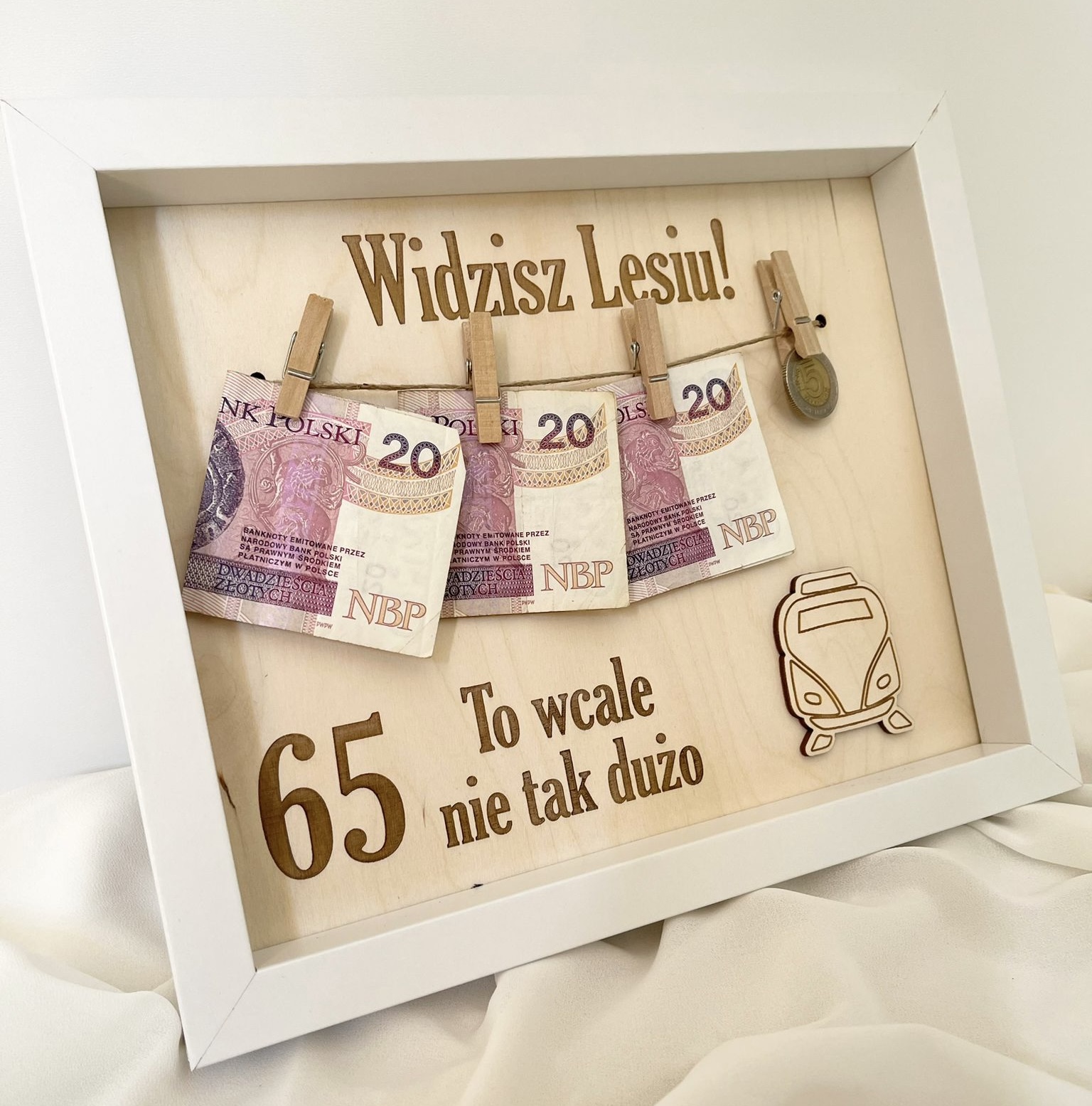 Nasza tabliczka urodzinowa z grawerem na sklejce, oprawiona w elegancką ramkę, to zabawny i kreatywny sposób na wręczenie gotówki – ale z humorem!