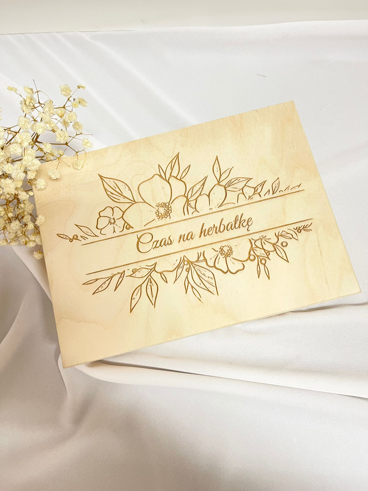 Wykonana z wysokiej jakości sklejki brzozowej, ozdobiona precyzyjnym grawerem i napisem „Czas na herbatę”.