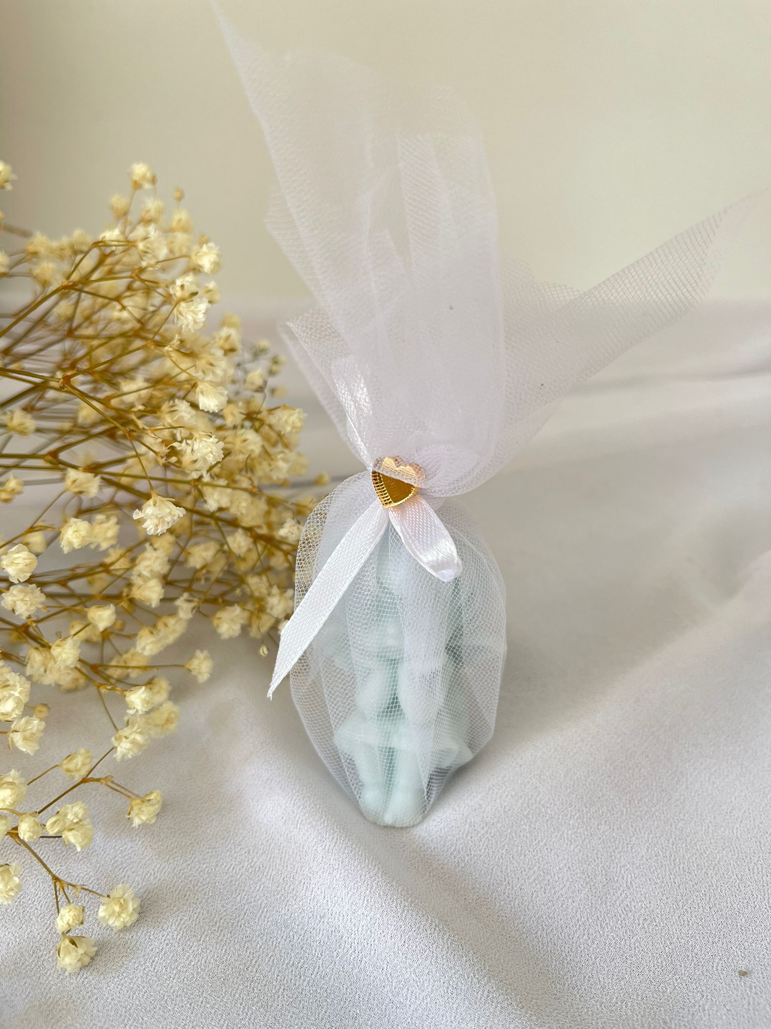 Elegancki i subtelny aniołek zapachowa zapakowany w delikatny woreczek z organzy, przewiązany satynową wstążką z ozdobnym złotym serduszkiem. To piękne i uniwersalne podziękowanie dla gości na wyjątkowe okazje.