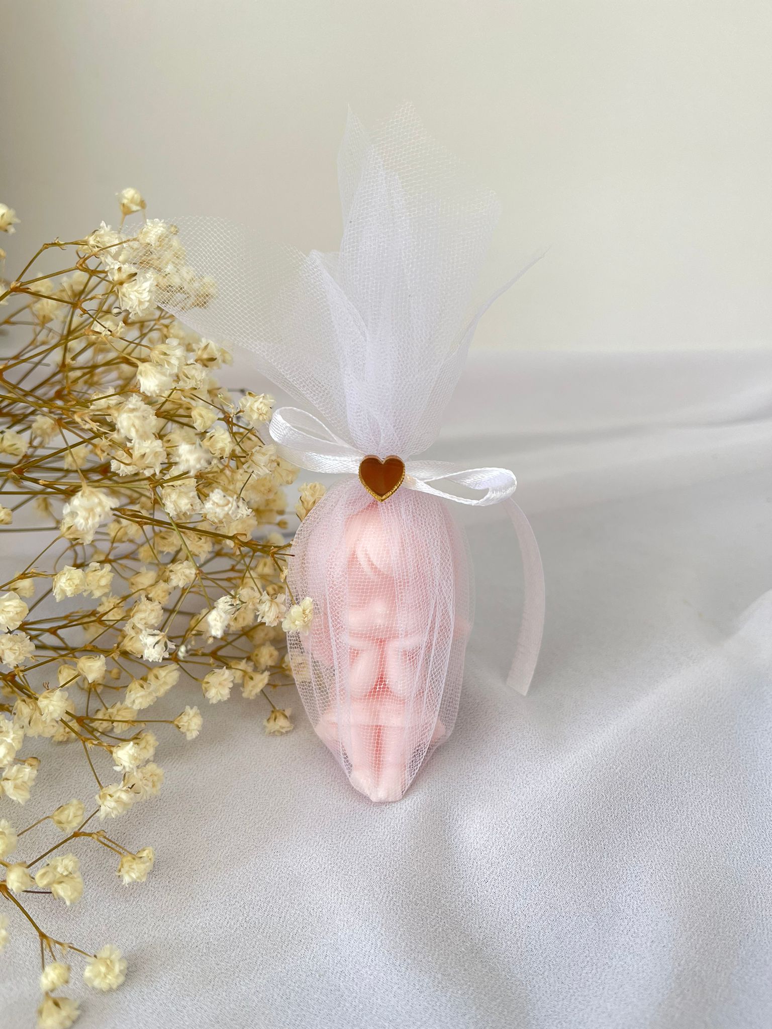 Elegancki i subtelny aniołek zapachowa zapakowany w delikatny woreczek z organzy, przewiązany satynową wstążką z ozdobnym złotym serduszkiem. To piękne i uniwersalne podziękowanie dla gości na wyjątkowe okazje.