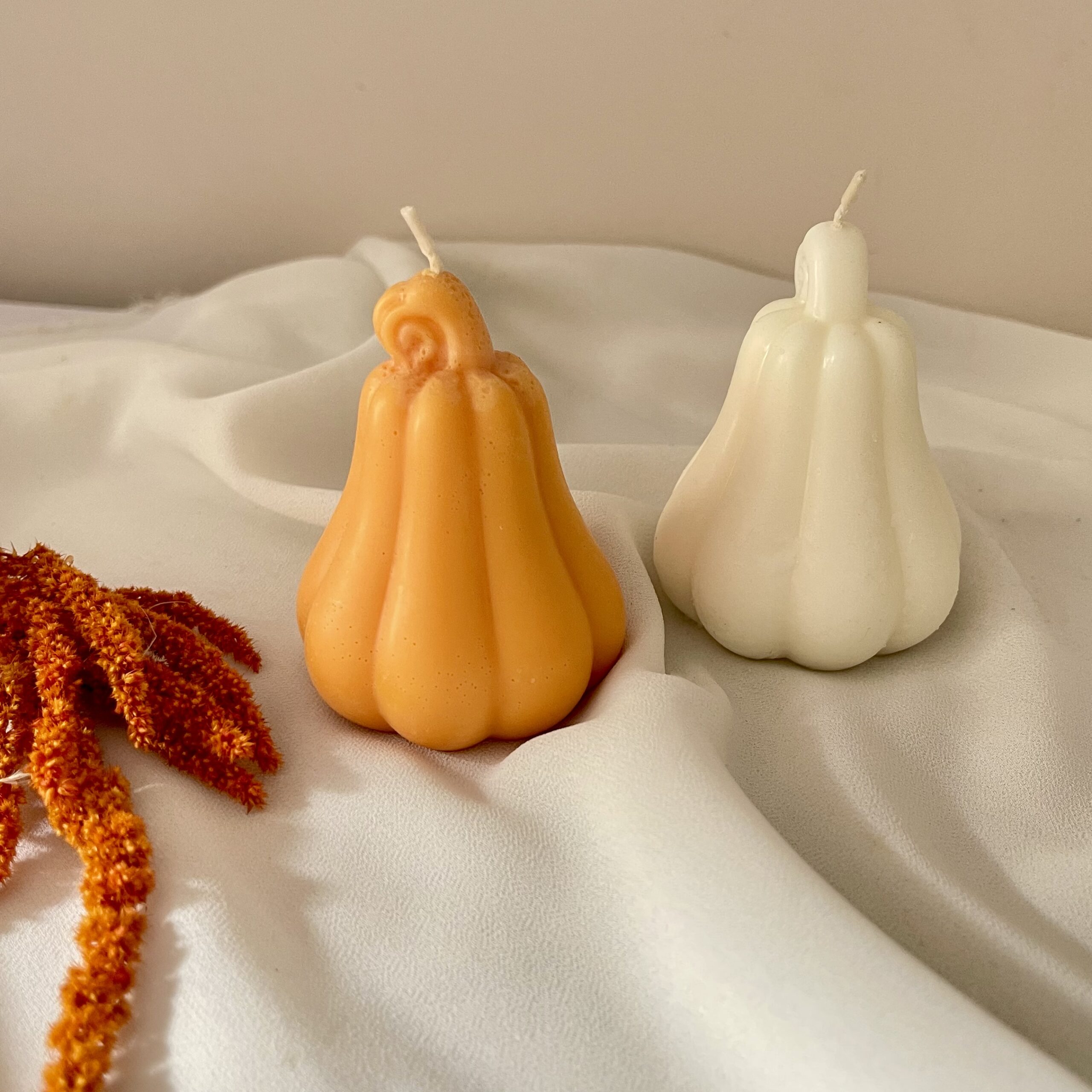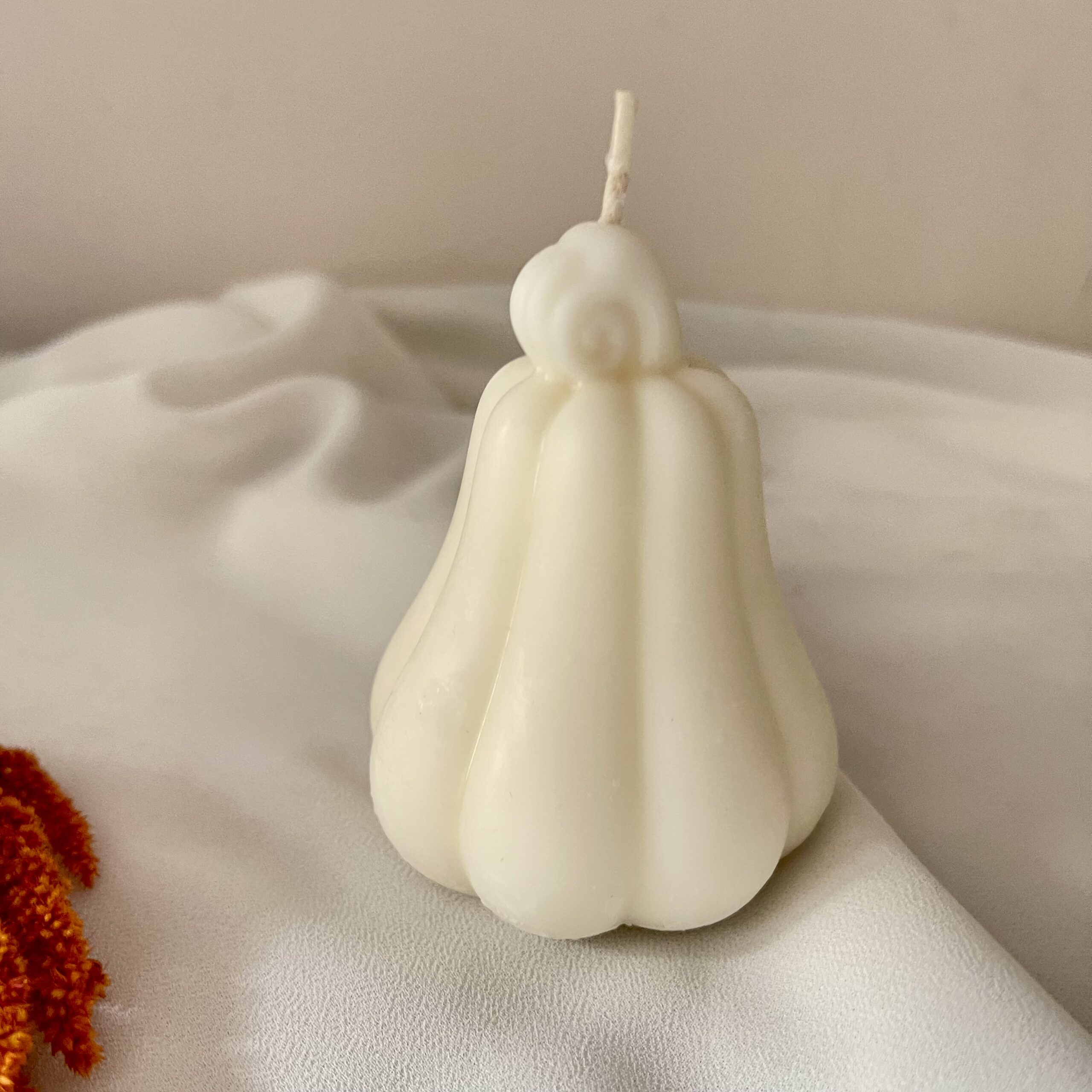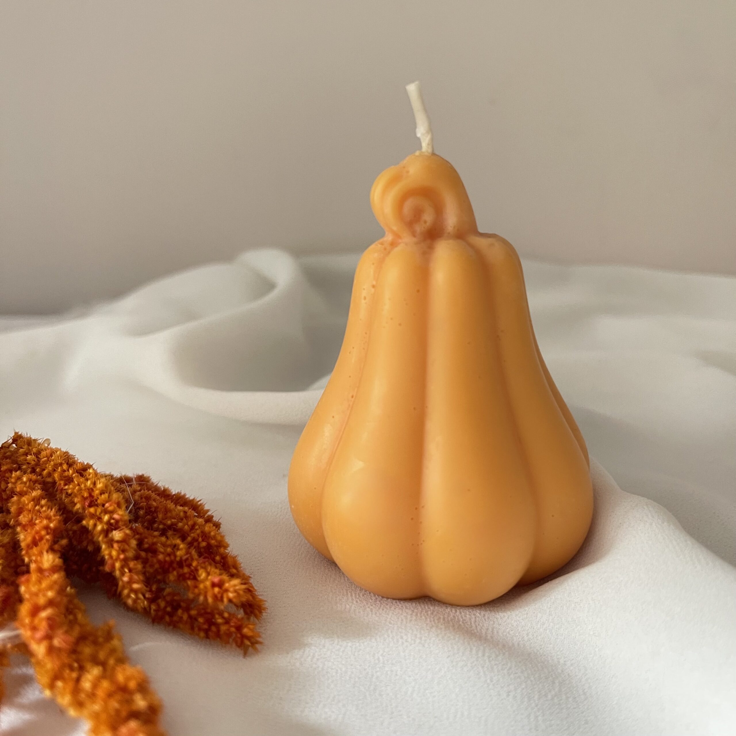 Ręcznie robiona świeca z naturalnego wosku sojowego, uformowana w kształt dyni.