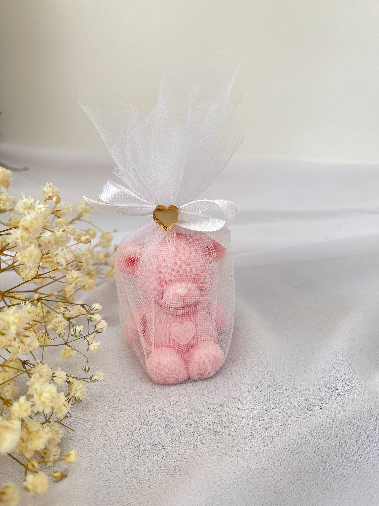 Elegancki i subtelny miś zapachowa zapakowany w delikatny woreczek z organzy, przewiązany satynową wstążką z ozdobnym złotym serduszkiem. To piękne i uniwersalne podziękowanie dla gości na wyjątkowe okazje.