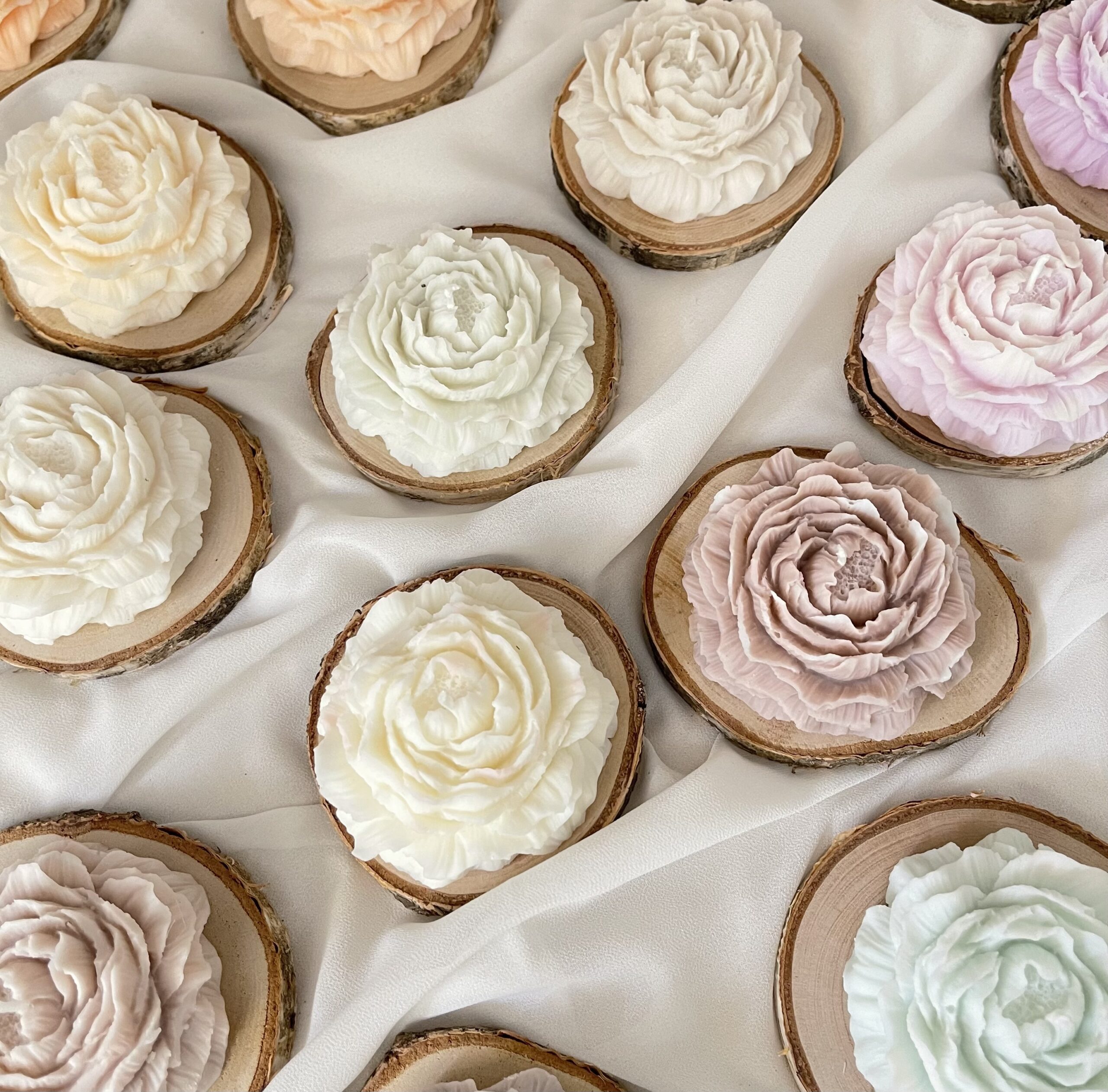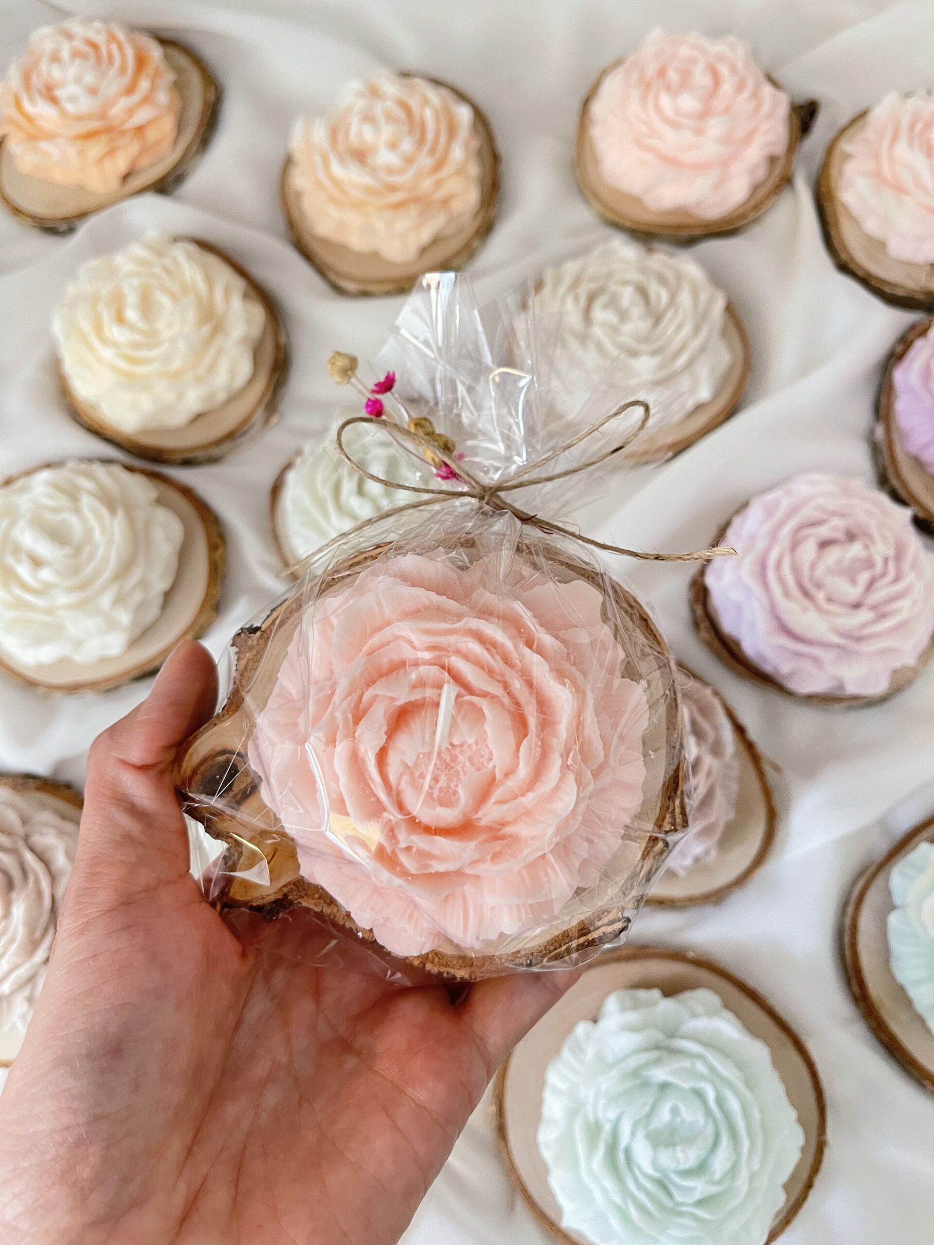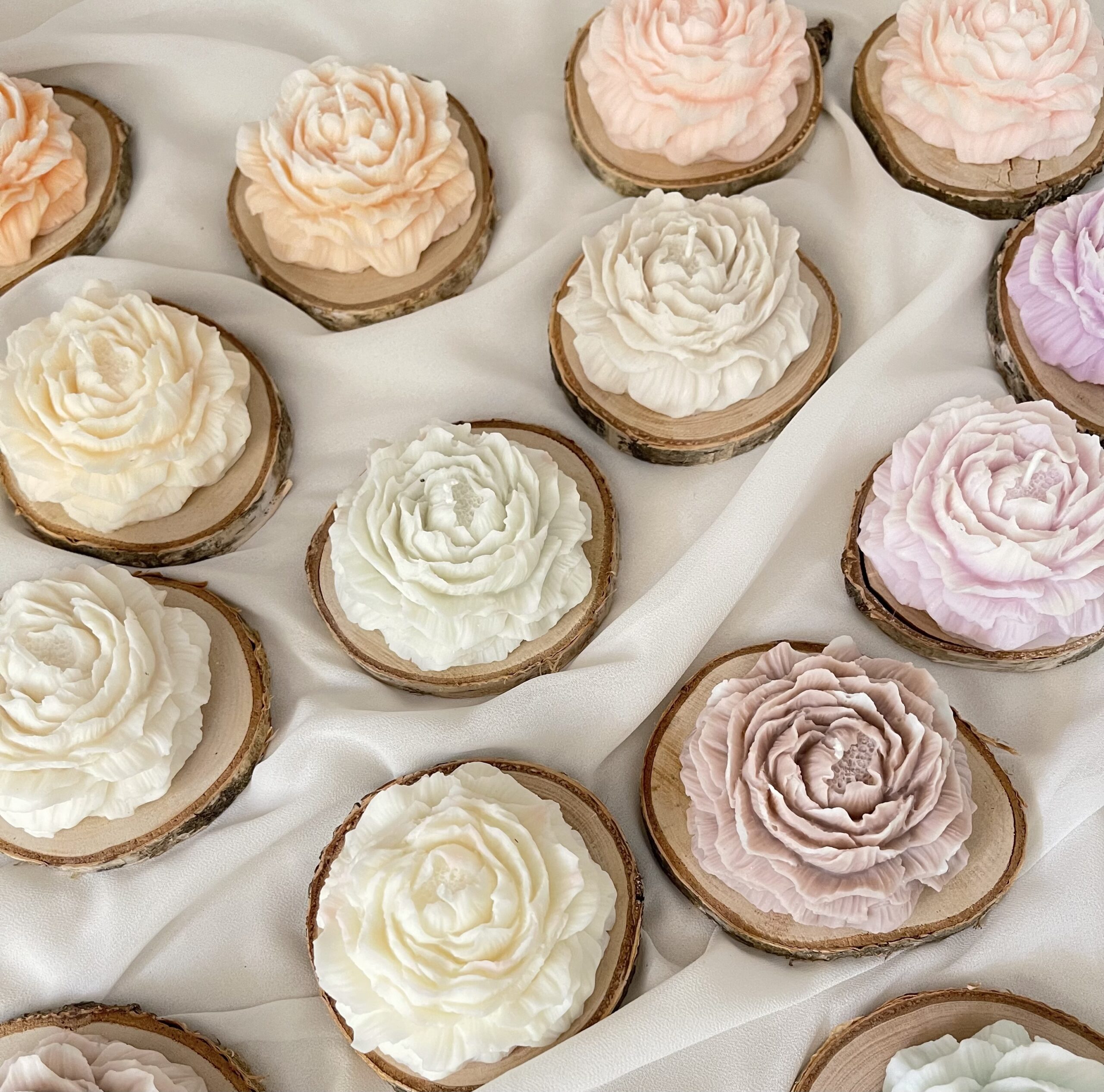 Świeca sojowa w kształcie piwonii – ręcznie robiona z naturalnego wosku, z dodatkiem suszonych kwiatów i ustawiona na drewnianym plastrze. Sprzedawana w ozdobnej różce, dostępna w wielu kolorach i delikatnych zapachach. Idealna na prezent, do dekoracji lub jako podziękowanie dla gości.