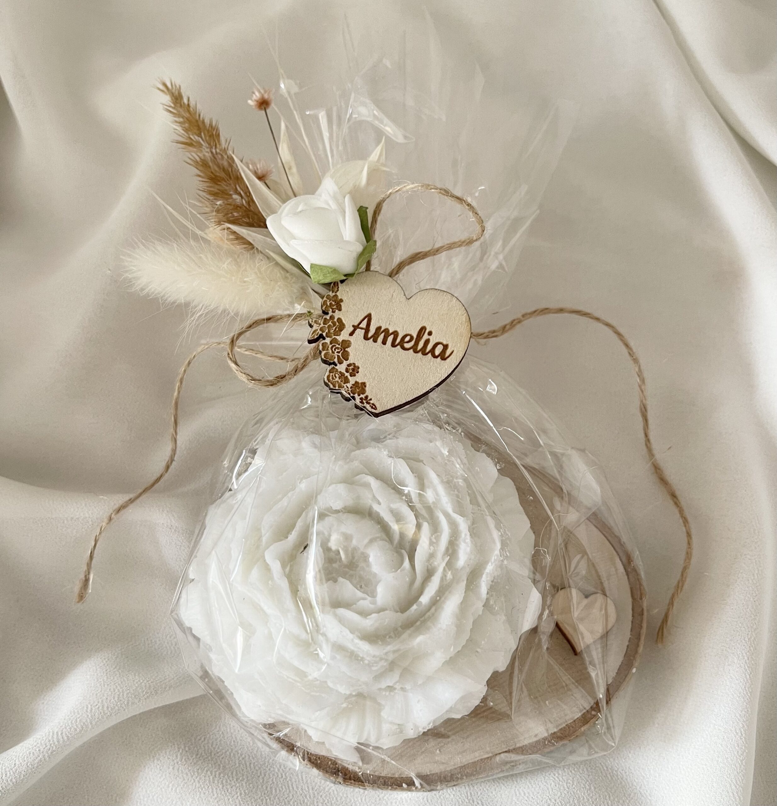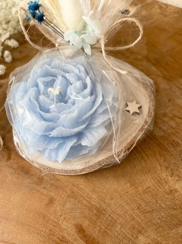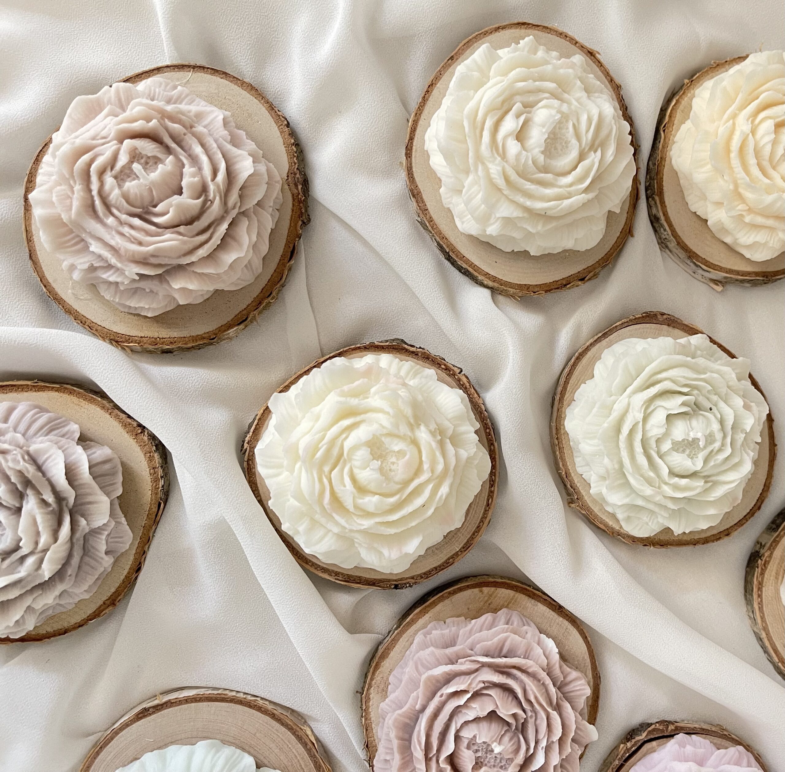 Świeca sojowa w kształcie piwonii – ręcznie robiona z naturalnego wosku, z dodatkiem suszonych kwiatów i ustawiona na drewnianym plastrze. Sprzedawana w ozdobnej różce, dostępna w wielu kolorach i delikatnych zapachach. Idealna na prezent, do dekoracji lub jako podziękowanie dla gości.