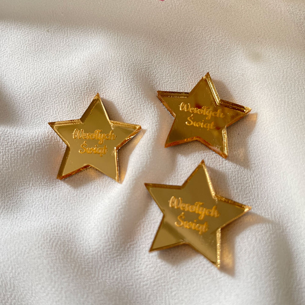 ZŁOTE GWIAZDKI Z PLEXI Z GRAWEREM „WESOŁYCH ŚWIĄT”